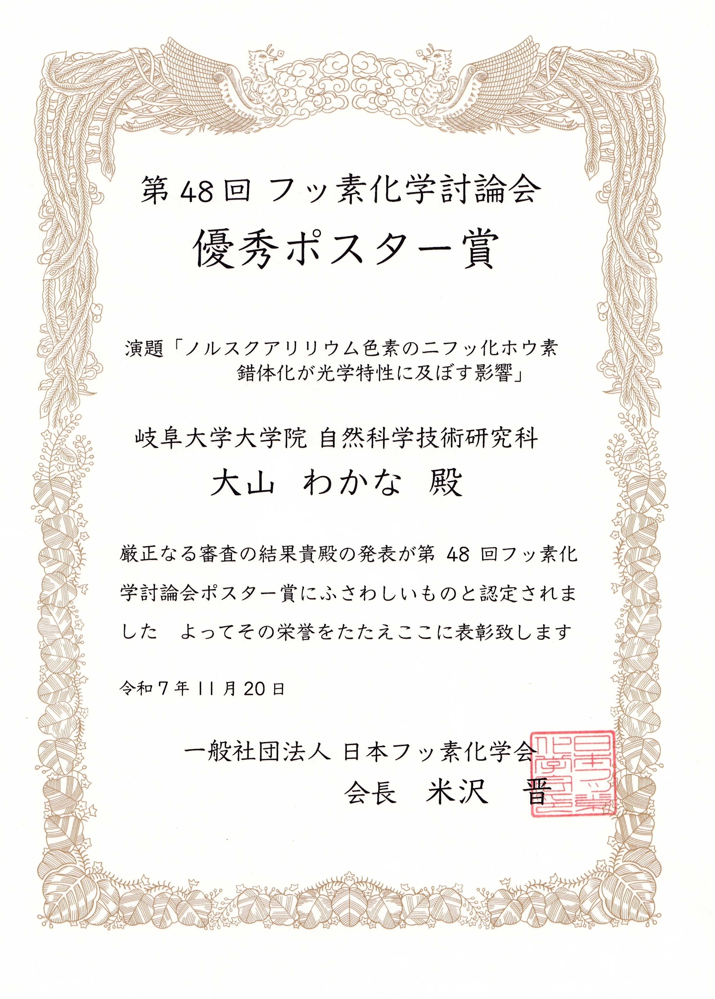 化学・生命工学科 物質化コース 船曳・犬塚・窪田・水野研究室の大山わかなさん(自然科学技術研究科 物質・ものづくり工学専攻 物質化学領域2年)が、2025年11月13-14日愛知県豊橋市で開催された「第48回フッ素化学討論会」において、優秀ポスター賞を受賞しました。