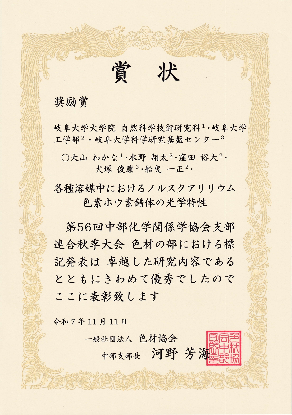 化学・生命工学科 物質化コース 船曳・犬塚・窪田・水野研究室の大山わかなさん(自然科学技術研究科 物質・ものづくり工学専攻 物質化学領域2年)が、2025年11月8-9日岐阜県岐阜市で開催された「第56回中部化学関係学協会支部連合秋季大会」において、奨励賞(色材協会中部支部)を受賞しました。