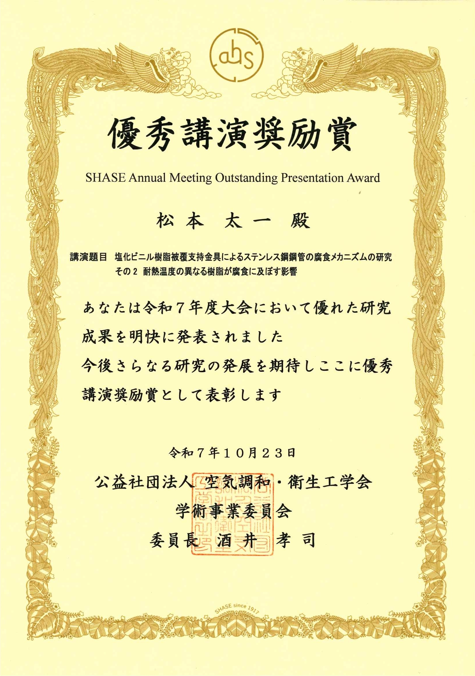 化学・生命工学科 物質化学コース 櫻田・吉田研究室の松本太一さん(自然科学技術研究科 物質・ものづくり工学専攻 物質化学領域1年)が、2025年9月4日香川県高松市で開催された「令和7年度空気調和・衛生工学会大会」において、優秀講演奨励賞を受賞しました。