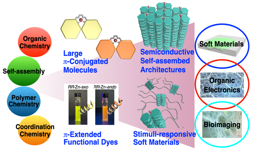 例えば、拡張したπ共役分子を有機合成によって開発し、その分子の集合体を制御することで、resilience(しなやかさ)をもつソフトマテリアルの開発や、半導体特性を含めた有機エレクトロニクス、バイオイミージングに資する研究を推進します。